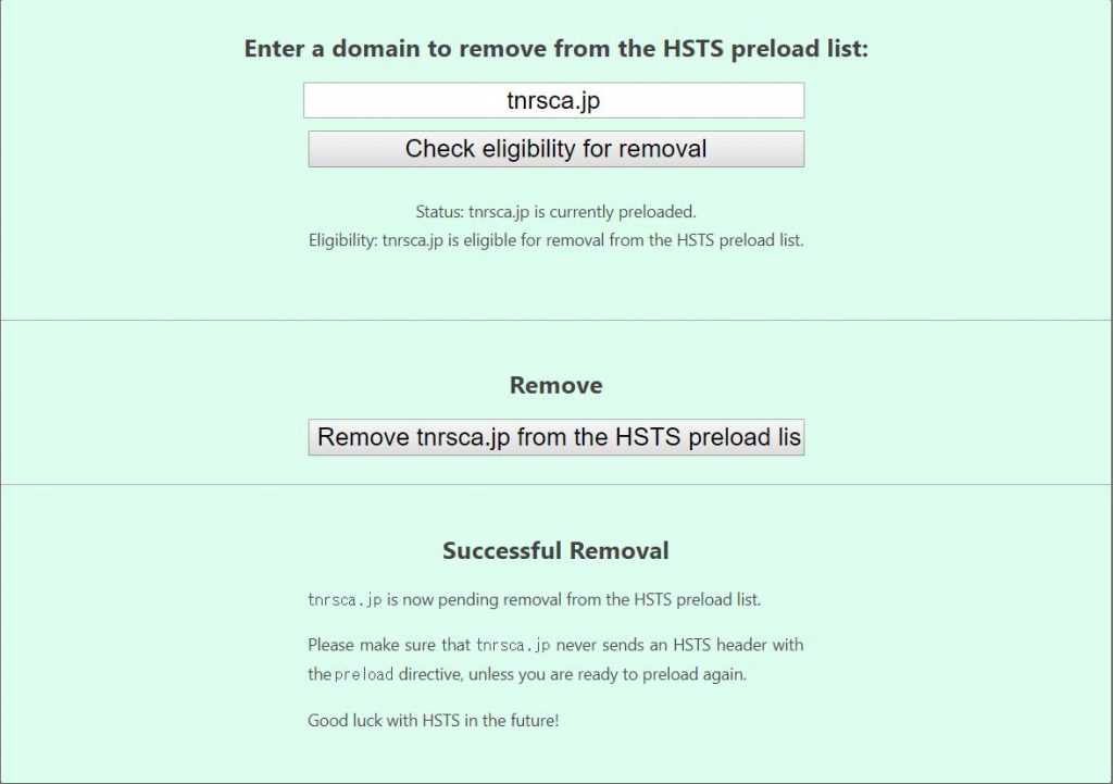 本来、HSTS preload listに登録されており、削除に適合すれば、削除ボタンが表示されます。