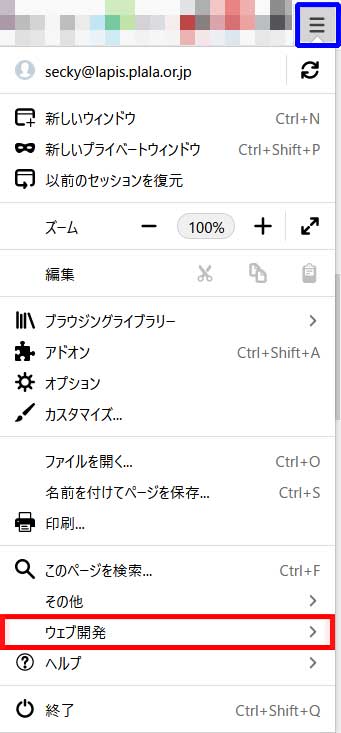 - 図5の青枠に示すメニューアイコンをクリックして表示されるドロップダウンメニューで「ウェブ開発」選択し、次に表示されるメニューから「開発ツールを表示する」をクリックします。