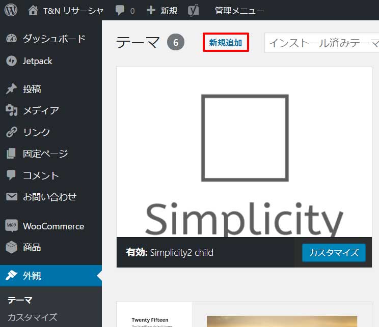 まず、Wordpressのテーマのインストールは「外観」→「テーマ」を選択し、「新規追加」をクリックします。