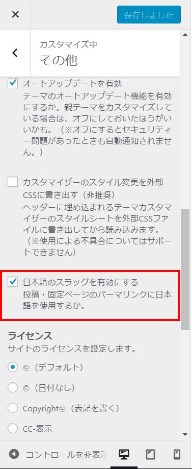 次に、その左側にあるメニューから「その他」を選択すると、「日本語のスラッグを有効にする」チェックボックスがあるので、このチェックボックスを有効にします。